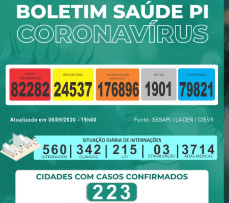 Dos leitos existentes na rede de saúde do Piauí para atendimento à Covid-19, há 560 ocupados, sendo 342 leitos clínicos, 215 UTIs e 3 leitos de estabilização. As altas acumuladas somam 3.714 até o dia seis de setembro.
