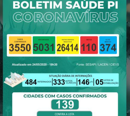 No total, o Piauí possui 3550 casos positivos de Covid-19 e 110 mortes pela doença.