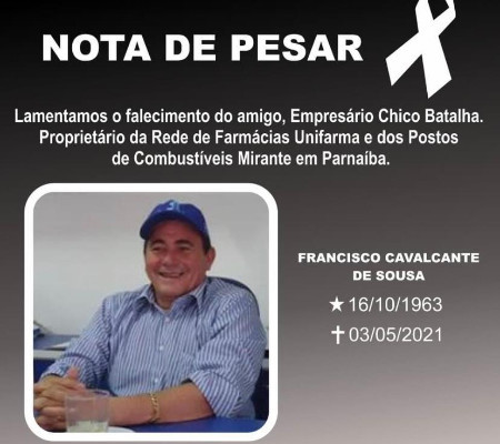 O empresário Francisco Cavalcante de Souza, de 57 anos, conhecido como Chico Batalha, morreu nesta segunda-feira (03) em um hospital particular de Teresina, vítima de complicações causadas pela Covid-19.