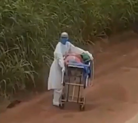 Nas imagens é possível ver a profissional de saúde e a paciente na maca encobertos pela poeira levantada pelas carretas que passavam na rodovia. Rebeka caminhou empurrando a maca por cerca de 2 quilômetros.