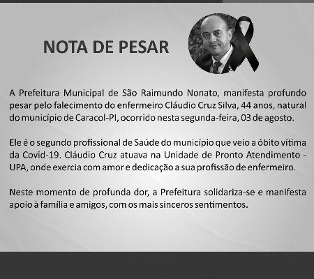 A Prefeitura Municipal de São Raimundo Nonato, manifesta profundo pesar pelo falecimento do enfermeiro Cláudio Cruz Silva, 44 anos, natural do município de Caracol-PI, ocorrido nesta segunda-feira, 03 de agosto.