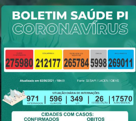 Dos leitos existentes na rede de saúde do Piauí para atendimento à Covid-19, há 971 ocupados, sendo 596 leitos clínicos, 349 UTIs e 26 em leitos de estabilização. As altas acumuladas somam 17.570 até o dia dois de junho de 2021.