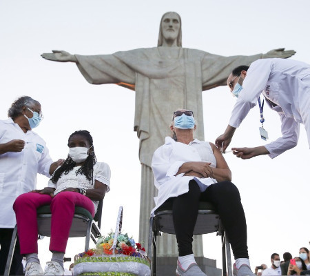Rio de Janeiro: Dulcineia da Silva, de 59 anos, técnica de enfermagem no hospital Ronaldo Gazola, e Teresinha da Conceição, de 80 anos, acolhida pelos serviços da Prefeitura em 2015 depois de ter sua casa demolida pela Defesa Civil. Elas foram vacinadas no Cristo Redentor.