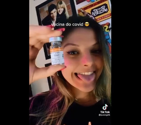 A jovem publicou o vídeo na rede social e escreveu a legenda "Vacina do Covid".