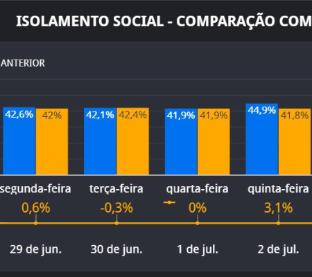 Os dados da startup também mostram o índice de isolamento social por regiões da cidade e, no sábado, a população da zona leste foi a que mais respeitou as determinações para ficar em casa, com um percentual de 53,66%. Em seguida vem a zona sul, com 53,23%; a zona centro-norte, com 53,01%, e a zona sudeste, com 51,35%.
