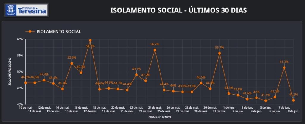 O índice de isolamento social em Teresina foi de 41,20% na última segunda-feira (08), é o que apontam os dados registrados pela Startup Inloco, que realiza o georreferenciamento de smartphones na cidade, monitorando a localização dos usuários. Em comparação com a segunda-feira da semana anterior, dia 01 de junho, que registrou índice de 43,3%, houve uma queda de 2,1% no distanciamento social na cidade no primeiro dia da semana.