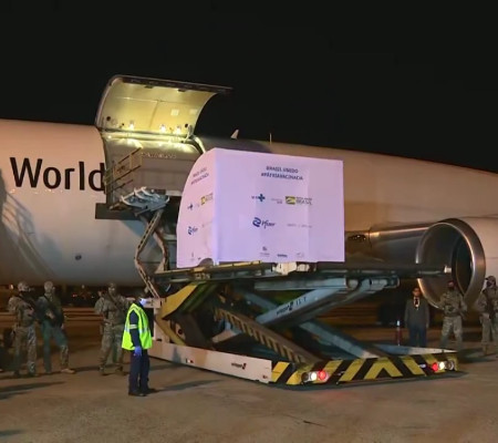 A aeronave carregada com 1 milhão de doses da vacina da Pfizer/BioNTech compradas pelo Brasil pousou no Aeroporto Internacional de Viracopos, em Campinas (SP), às 19h22 desta quinta-feira (29). O desembarque e a entrega do primeiro lote de um contrato para 100 milhões de doses feito pelo governo federal foi acompanhado pelo ministro da Saúde, Marcelo Queiroga.