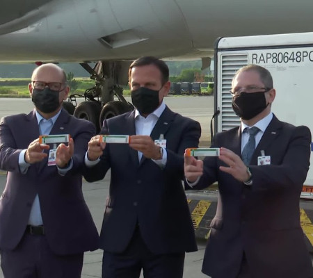 "Viemos receber aqui mais um lote da vacina CoronaVac, da vacina do Butantan, a vacina que vai salvar a vida de milhões brasileiros. Hoje recebemos insumos para 1 milhão de doses da vacina. Somados aos 20 mil que já recebemos, agora temos 1 milhão e 120 mil doses da vacina", afirmou Doria.