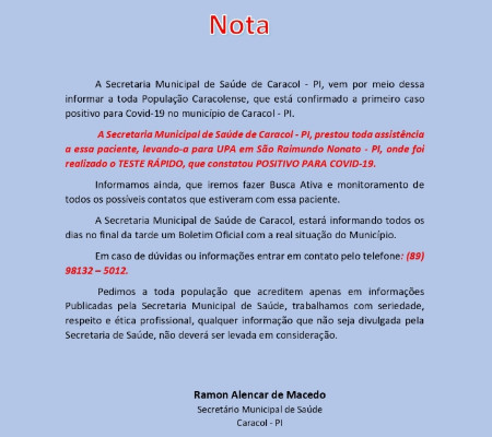 A Secretaria de Saúde da cidade de Caracol, no Piauí, confirmou, neste domingo, (12/04), o primeiro caso de coronavírus na região de São Raimundo Nonato, território da Serra da Capivara. Trata-se de uma mulher de 83 anos. Agora está sendo investigado se há histórico de contato com alguém que chegou de viagem na região, provavelmente vindo do município de Goiânia (GO). As informações são do Portal O Sertão.