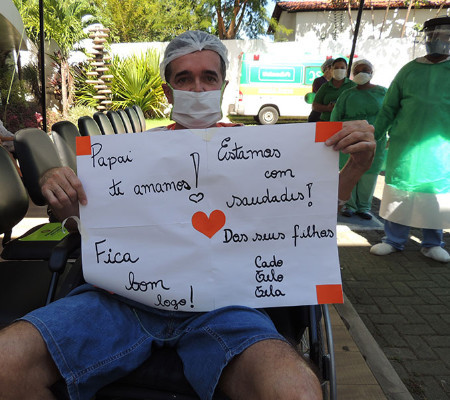 Para ajudar João a diminuir um pouco a saudade dos filhos, os profissionais de saúde do HUP promoveram um encontro surpresa do pai com seus três filhos. No estacionamento do Hospital, os filhos ficaram dentro carro e colocaram uma mensagem de amor e saudade em um lindo cartaz decorado com coração. “Poder ver meus filhos depois de tantos dias foi um grande presente. Só tenho a agradecer a equipe do Hospital Unimed. Foi uma grande surpresa. Fiquei muito feliz. É muito bom ser bem recebido e tratado com carinho”, disse emocionado.