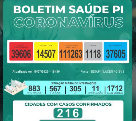 O número de  cidades piauienses atingidas pela pandemia permanece 216. Os municípios que não tiveram casos registrados de Covid-19 até agora são Arraial, Canavieira, Cristalândia, Francisco Macedo, Jardim do Mulato, João Costa e Nova Santa Rita.