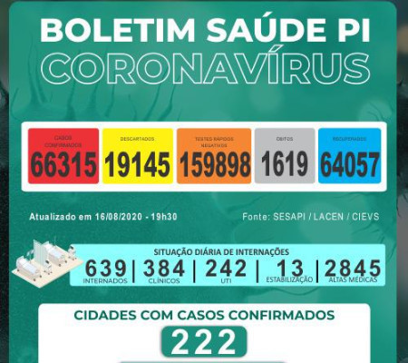 Dos leitos existentes na rede de saúde do Piauí para atendimento à Covid-19, há 639 ocupados, sendo 384 leitos clínicos, 242 UTIs e 13 leitos de estabilização. As altas acumuladas somam 2.845 até o dia 16 de agosto.