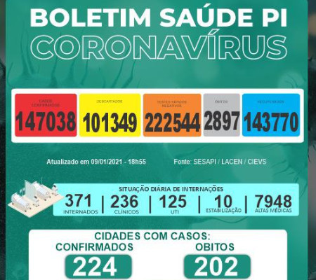 Dos leitos existentes na rede de saúde do Piauí para atendimento à Covid-19, há 371 ocupados, sendo 236 leitos clínicos, 125 UTIs e 10 em leitos de estabilização. As altas acumuladas somam 7.948 até o dia nove de janeiro de 2021.