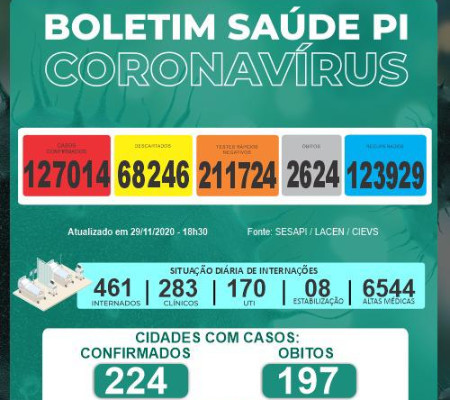 Dos leitos existentes na rede de saúde do Piauí para atendimento à Covid-19, há 461 ocupados, sendo 283 leitos clínicos e 170 UTIs e oito em leitos de estabilização. As altas acumuladas somam 6.544 até o dia 29 de novembro.