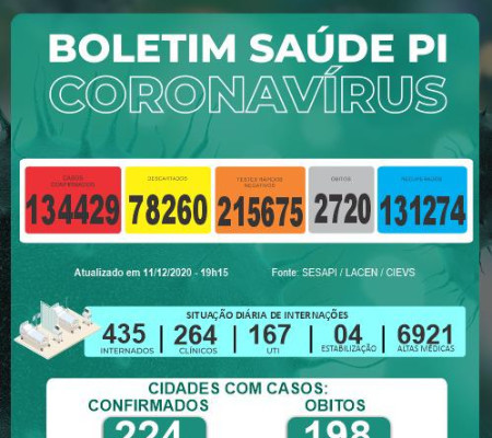 Dos leitos existentes na rede de saúde do Piauí para atendimento à Covid-19, há 435 ocupados, sendo 264 leitos clínico, 167 UTIs e quatro em leitos de estabilização. As altas acumuladas somam 6.921 até o dia 11 de dezembro. A Sesapi estima que 131.274 pessoas já estão recuperadas ou seguem em acompanhamento (casos registradas nos últimos 14 dias) que não necessitaram de internação ou evoluíram para morte.