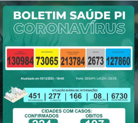 Os casos confirmados no estado somam 130.984 distribuídos em todos os municípios piauienses. Já os óbitos pelo novo coronavírus chegam a 2.673 e foram registrados em 197 municípios. Até agora, morreram 1.559 homens e 1.114 mulheres.