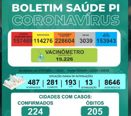 Dos leitos existentes na rede de saúde do Piauí para atendimento à Covid-19, há 487 ocupados, sendo 281 leitos clínicos, 193 UTIs e 13 em leitos de estabilização. As altas acumuladas somam 8.646 até o dia 27 de janeiro de 2021.