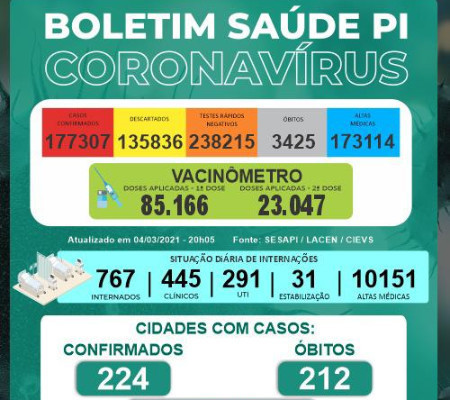 Os casos confirmados no estado somam 177. 307 distribuídos em todos os municípios piauienses. Já os óbitos pelo novo coronavírus chegam a 3.425 e foram registrados em 212 municípios. Curral Novo registrou a primeira morte pela Covid-19. Até agora, morreram 2.010 homens e 1.415 mulheres.