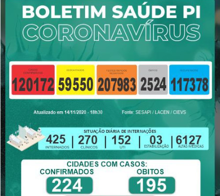 Dos leitos existentes na rede de saúde do Piauí para atendimento à Covid-19, há 425 ocupados, sendo 270 leitos clínicos, 152 UTIs e três leitos de estabilização. As altas acumuladas somam 6.127 até o dia 14 de novembro.
