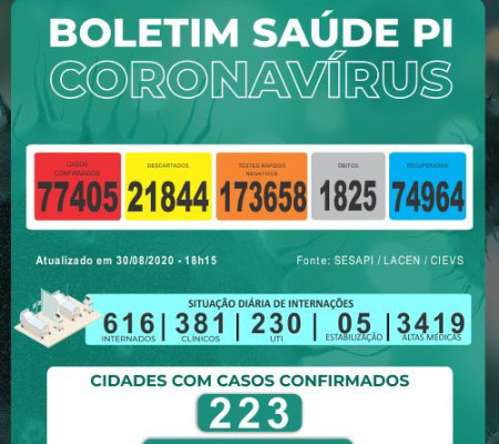 Dos leitos existentes na rede de saúde do Piauí para atendimento à Covid-19, há 616 ocupados, sendo 381 leitos clínicos, 230 UTIs e 5 leitos de estabilização. As altas acumuladas somam 3.419 até o dia 30 de agosto.