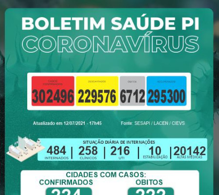 Os casos confirmados no estado somam 302.496 distribuídos em todos os municípios piauienses. Já os óbitos pelo novo coronavírus chegam a 6.712 e foram registrados em 222 municípios.