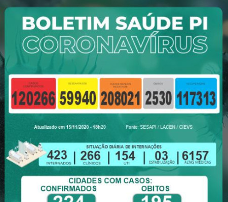 Dos leitos existentes na rede de saúde do Piauí para atendimento à Covid-19, há 423 ocupados, sendo 266 leitos clínicos, 154 UTIs e três leitos de estabilização. As altas acumuladas somam 6.157 até o dia 15 de novembro.