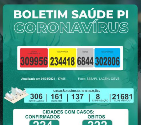 Os casos confirmados no estado somam 309.956 distribuídos em todos os municípios piauienses. Já os óbitos pelo novo coronavírus chegam a 6.844 e foram registrados em 222 municípios.