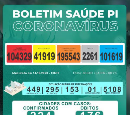 Dos leitos existentes na rede de saúde do Piauí para atendimento à Covid-19, há 449 ocupados, sendo 295  leitos clínicos, 153 UTIs e 1 leito de estabilização. As altas acumuladas somam 5.108 até  o dia 14 de outubro.