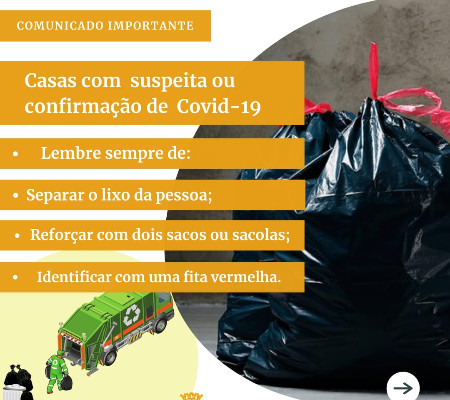 O gestor acrescenta que os moradores de casas onde há pessoas com Covid devem separar o lixo da pessoa que está com a doença, borrifar o interior das sacolas com água sanitária, depois devem juntar todos os sacos dentro de um saco maior, que será amarrado com uma fita vermelha para sinalizar que há risco de contaminação.