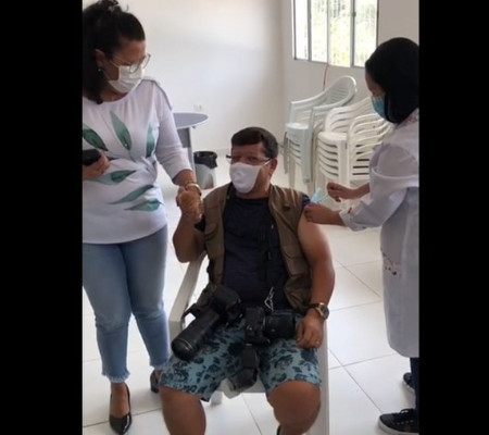 O vídeo com o momento da vacinação foi postado nas redes sociais. “Aqui, olha, Jupi recebendo as primeiras doses. Aproveitando o embalo”, diz ele, com a máquina fotográfica pendurada no pescoço.