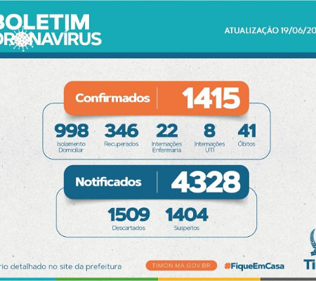 A Secretaria Municipal de Saúde de Timon divulgou um novo boletim epidemiológico, neste sábado (20), informando que subiu para 1.415 o número de casos confirmados do novo coronavírus no município. De acordo com o levantamento que foi feito ontem, nenhum novo óbito foi registrado nas últimas 24 horas, permanecendo o registro de 41 mortes causadas pela Covid-19 em Timon até o momento.