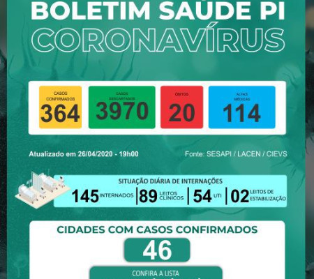 Com isso, 46 municípios do Piauí passam a ter casos confirmados do novo coronavírus. Dos casos positivos, são 14 mulheres e 19 homens, com idades que variam de 9 anos a 79 anos. O total de casos confirmados no Estado até agora é de 364. O número de mortos é 20.