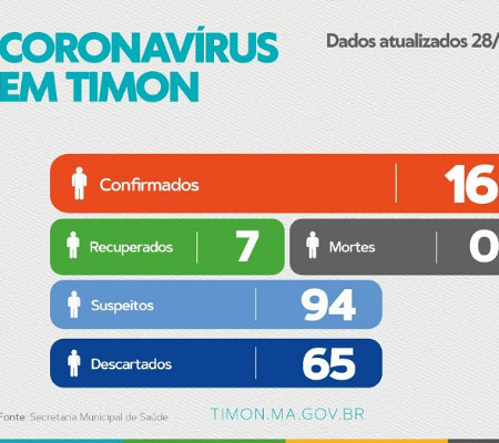 A Secretaria de Saúde de Timon divulgou o boletim epidemiológico de terça-feira (28/04). Os dados mostram atualização sobre casos de Covid-19 no município. Até hoje, foram registrados os seguintes números: 16 casos confirmados, 7 recuperados, 0 mortes, 94 suspeitos e 65 descartados.