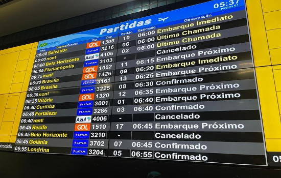 No aeroporto internacional, em Guarulhos, ao menos cinco voos nacionais foram cancelados na manhã desta segunda (10). Em Congonhas, somente da Latam, 19 voos que estavam previsto serão remarcados.