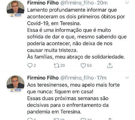 O gestor municipal lamentou profundamente informar os dois primeiros óbitos por Covid-19, em Teresina. "Essa é uma informação que é muito sofrida de dar e que, mesmo sabendo que poderia acontecer, não deixa de nos causar muita tristeza. Às famílias, meu abraço de solidariedade", publicou.