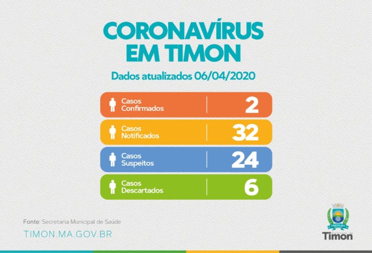O boletim da Secretaria Municipal de Saúde de segunda-feira (06/04) aponta que o município de Timon continua com 2 casos confirmados do coronavírus, 32 notificados, 24 suspeitos e 6 descartados.