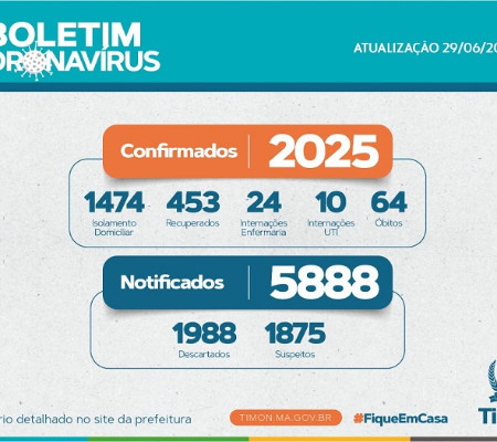 O levantamento feito pela Secretaria Municipal de Saúde, em Timon, no Maranhão, desta segunda-feira (29), mostra que a cidade contabiliza agora 5888 casos notificados, 1875 suspeitos, 1988 descartados, 2025 confirmados, 453 recuperados e 64 óbitos pela Covid-19, doença causada pelo novo coronavírus.