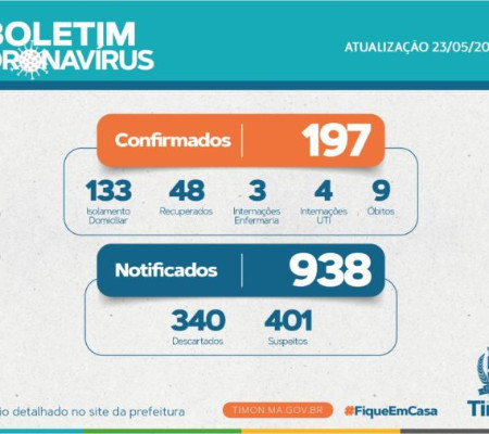Um novo boletim epidemiológico sobre a Covid-19, doença causada pelo novo coronavírus, na cidade Timon, no Maranhão, foi divulgado neste sábado, 23 de maio. De acordo com a Secretaria Municipal de Saúde, são 938 casos notificados, 401 casos suspeitos, 340 casos descartados, 197 confirmados, 48 recuperados e 09 óbitos.