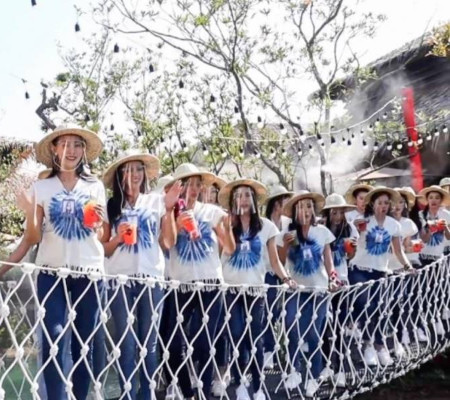 Uma câmera profissional registrou o momento em uma ponte com todas as 30 candidatas a Miss Tailândia caiu.
