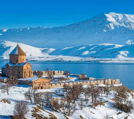 De grandes altitudes, selvagem e desolada, tudo sobre a região de Van do sudeste da Turquia é extremo: o lago Van é o maior do país, e os vulcões que se elevam sobre as costas norte e oeste são seus picos mais altos. Com pequenas ilhas em torno do lago e antigos castelos, igrejas, mesquitas e túmulos em suas margens, o local possui paisagem deslumbrante. O lago é tão salgado que a maior parte dele não congela no inverno. Por isso, mesmo em meados de janeiro, é possível pegar uma barca para a Ilha Akdamar para visitar a Igreja da Santa Cruz do século 10 - uma igreja real do Reino Armênio de Vaspurakan.