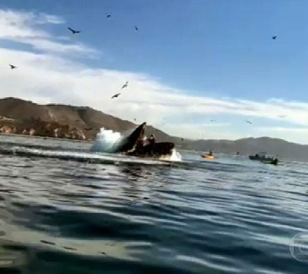 As americanas Julie McSorley e Elizabeth Cotriell se empolgaram ao verem duas baleias que nadavam a cerca de 15 metros de distância delas. Do nada, uma imagem que era de tranquilidade, assusta. Uma das baleias parte para cima do caiaque delas, já com a boca aberta.