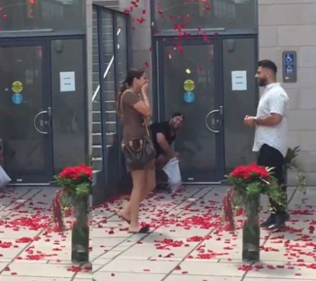 O pedido de casamento aconteceu em frente à um mercado público na cidade de Ottawa, no Canadá, e a jornalista Alison Mah, que estava passando pelo local, gravou o momento e postou no Twitter. O vídeo foi visto mais de 13,7 milhões de vezes, mas mesmo que o foco tenha sido o casal, quem brilhou mesmo foi o melhor amigo do noivo.