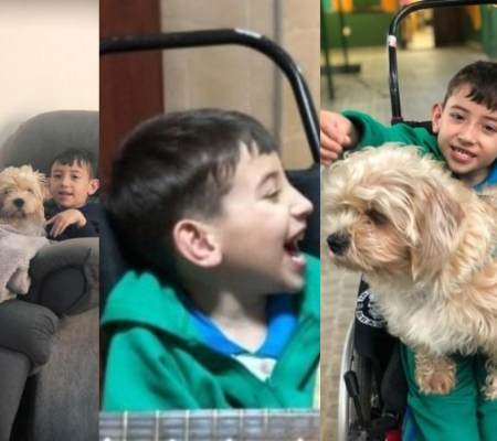 A ligação entre os dois é muito estreita. O cachorrinho fica ao lado dele, apoia a com a boca a perna do menino, é um negócio impressionante, ajudou muito a recuperar uma série de coisas, inclusive a falar. É uma terapia, é muito importante.
