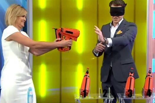 Apresentadora dá susto ao apontar arma de pregos para si mesma no ar