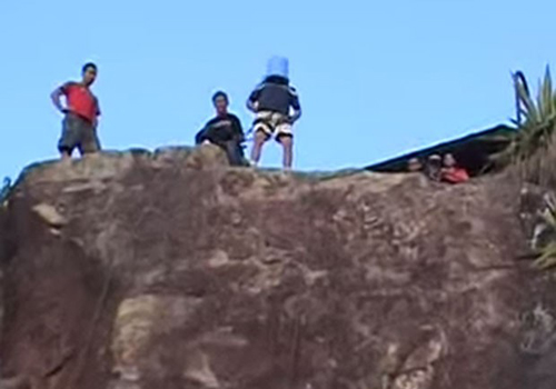 Na gravação, o homem faz graça no topo da formação rochosa na região de Kangaroo Point, em Brisbane e, em seguida, sai correndo, preso pela corda na região da cintura. Felizmente, a queda é evitada, e Hall fica pendurado a poucos metros do chão, ainda com seu balde na cabeça.