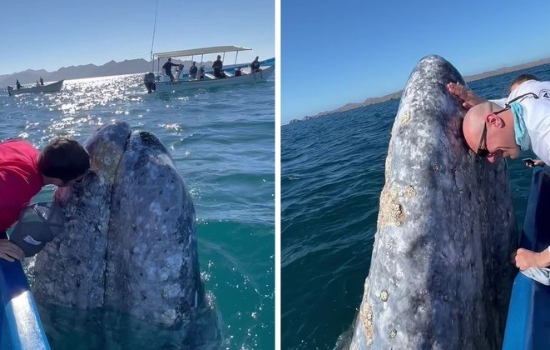 Uma baleia-cinzenta muito amigável usou parte da cabeça enorme para interagir com um grupo de turistas em um barco. A interação foi tão longa que deu tempo de ela ganhar beijos de vários deles e depois se despedir com um jato de água.