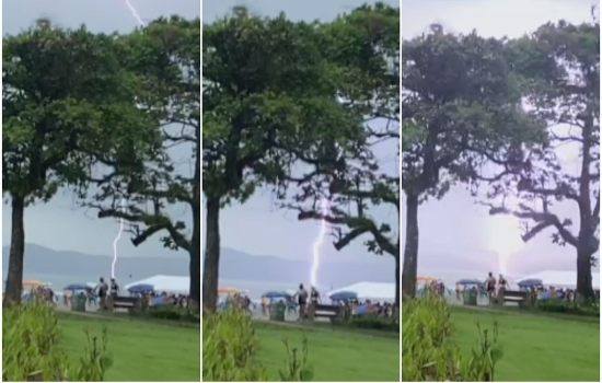 Segundo o fisioterapeuta, em seguida, ele pegou o celular para tentar filmar caso caísse outro raio. "Comecei a filmar em câmera lenta e, na hora que liguei o celular, caiu bem no cantinho do vídeo um raio também no mar, bem no meio, entre São Vicente e Santos, com um barulho bem forte de novo. Tinha poucas pessoas no mar e muita gente na areia. Os salva-vidas apitaram para as pessoas saírem, mas a maioria não saiu", destaca.