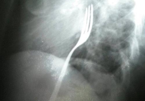 Quando a equipe fez um exame de raio-X no homem, descobriu que o desconforto e a dor eram causados por um garfo preso na garganta de Radu. ?Bebi e apostei com um amigo que conseguiria engolir um garfo sem me machucar?.