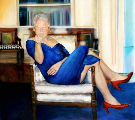 A obra retrata o ex-presidente americano Bill Clinton sentado e usando vestido azul e sapatos de salto alto em um cenário que lembra o Salão Oval da Casa Branca. O vestido é semelhante a um usado por Hillary Clinton em um evento social em 2009.