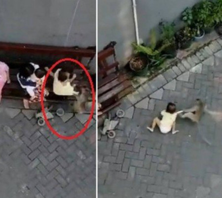 A cena foi registrada em vídeo. O macaco pedalou por uma rua estreita até encontrar um grupo de pessoas - umas mulher e as três filhas - sentadas em um banco. O animal largou a moto, agarrou uma das meninas e começou a arrastá-la pelo chão.